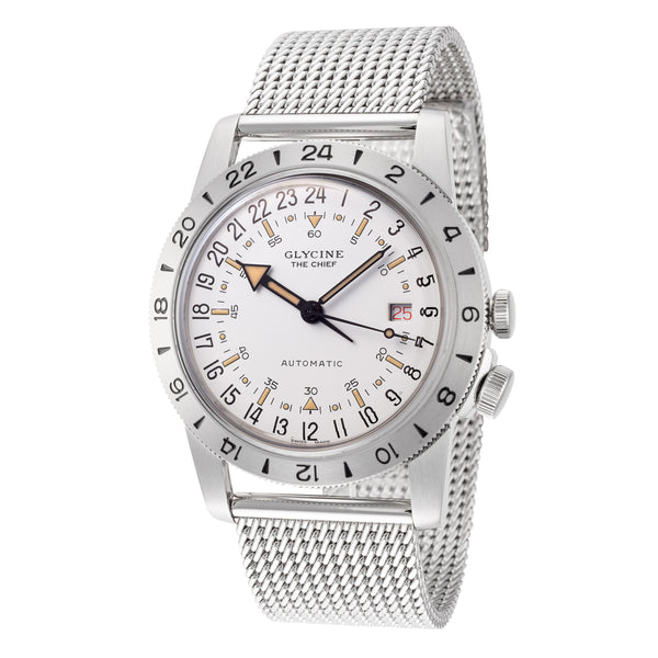 Glycine Men's Airman The Chief Purist 40mm Watch. The case is built with high-quality Stainless Steel and can with stand up to 30 m (100 feet) of water resistance. The dial is White and protected by a Sapphire Crystal Scratch Resistant. The Bracelet Mesh Style Silver Stainless Steel and the movement is Automatic (GL0470)