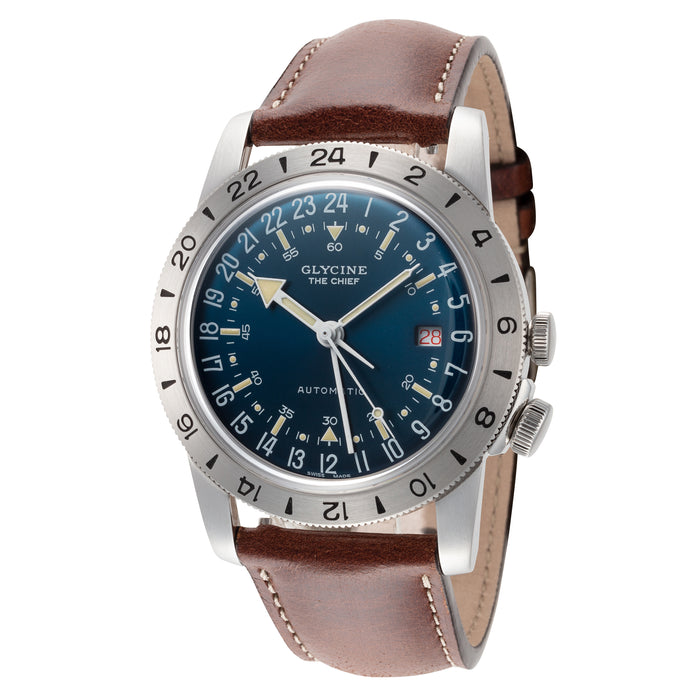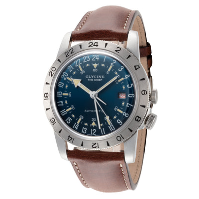 Glycine Men's Airman Vintage GMT 40mm Watch. The case is built with high-quality Stainless Steel and can with stand up to 30 m (100 feet) of water resistance. The dial is Blue and protected by a Sapphire Crystal Scratch Resistant. The Strap Brown Leather and the movement is Automatic (GL0306)