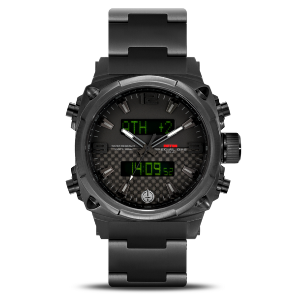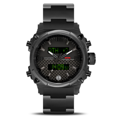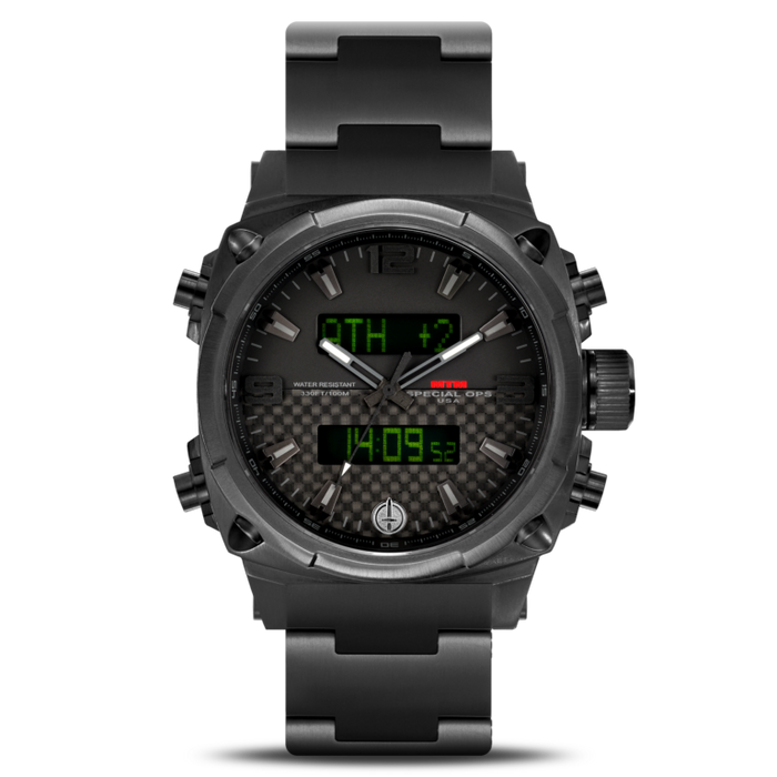 MTMs Air Stryk II is a mens military watch offering precise analog and digital timekeeping. The digital display can be used as a compass, time/date display, provide time for different time zones, an alarm, and more. This sophisticated timepiece also features luminous index and hands, making it easy to read. Moreover, its solid titanium case and 330-feet of water-resistance put this watch on another level. Built for everyday tactical use, MTMs Air Stryk II is ready for action!