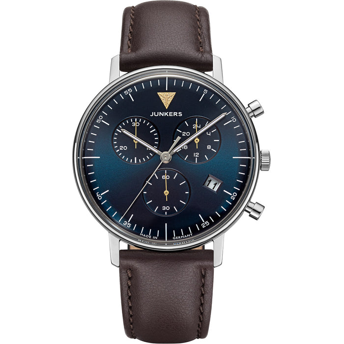 Junkers watches series Bauhaus Design classic chronograph with small second color blue 40 mm leather strap domed watch glass No. 912.01.12