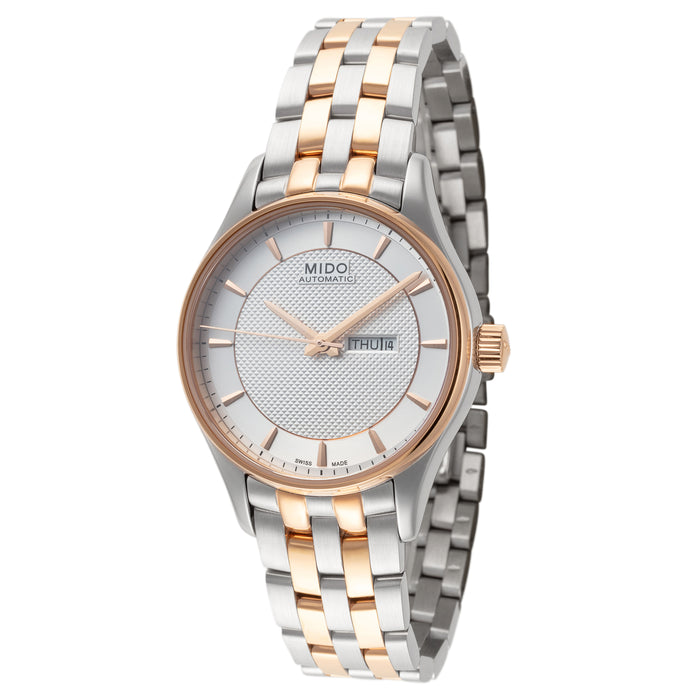 Mido Women's Belluna Automatic Watch. The case is built with high-quality Stainless Steel and can withstand up to 100 m (330 feet) of water resistance. The dial is Silver and protected by a Sapphire Crystal Scratch Resistant. The Bracelet is Two Tone Stainless Steel with a Deployment Clasp. The movement is Swiss-Made Automatic. (M0012302203191)