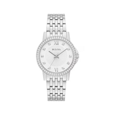 Bulova Women's Classic 32mm Watch. The case is built with high-quality Stainless Steel and can with stand up to 30 m (100 feet) of water resistance. The dial is Silver and protected by a Mineral Crystal. The Bracelet is Silver Tone Stainless Steel and the movement is Quartz (96L297)