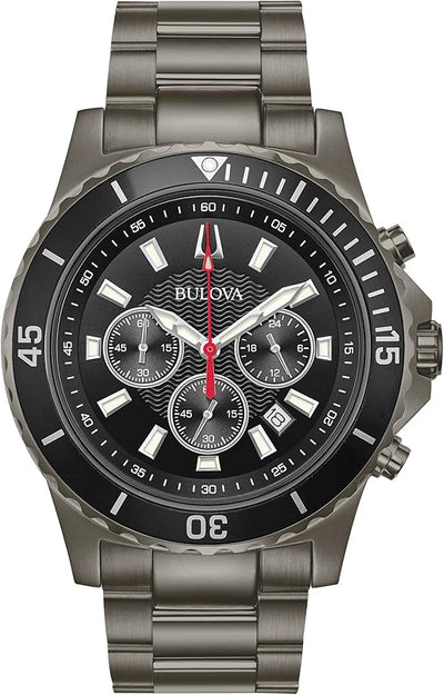 Bulova Men's Classic 44mm Watch. The case is built with high-quality Stainless Steel and can with stand up to 100 m (330 feet) of water resistance. The dial is Black and protected by a Mineral Crystal. The Bracelet is Black Stainless Steel and the movement is Quartz (98B337)