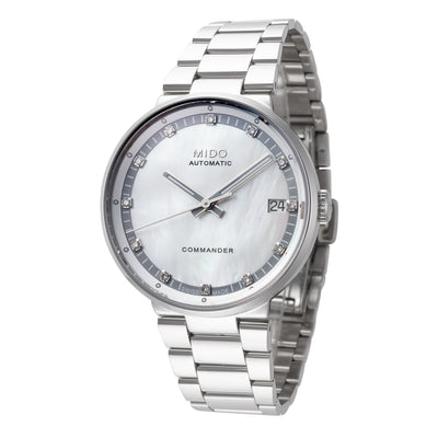 Mido Women's Commander II 33mm Watch. The case is built with high-quality Stainless Steel and can with stand up to 50 m (165 feet) of water resistance. The dial is Mother-of-Pearl and protected by a Sapphire Crystal Scratch Resistant. The Bracelet is Silver Tone Stainless Steel and the movement is Automatic (M0142071111680)