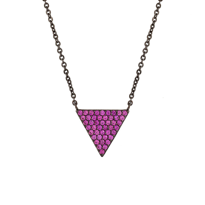 A simple triangle pendant made spectacular by 40 mini stones set in 18kt gold. This triangle necklace comes in several colors to match your every outfit and mood.