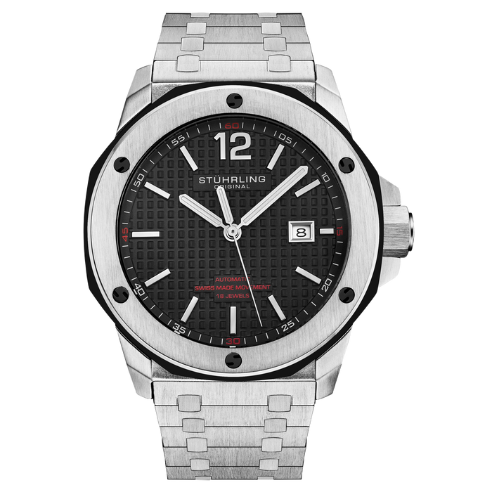 Men's Automatic Silver Alloy Case, Black Dial, Integrated Decrescendo AP Style Rectangular Stud Bracelet Band