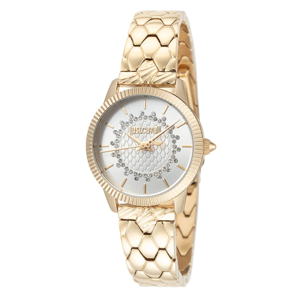 Just Cavalli Women's Glam Chic 28mm Watch. The case is built with high-quality Stainless Steel and can with stand up to 50 m (165 feet) of water resistance. The dial is White and protected by a Mineral Crystal. The Bracelet is Silver Stainless Steel and the movement is Quartz (JC1L258M0235)