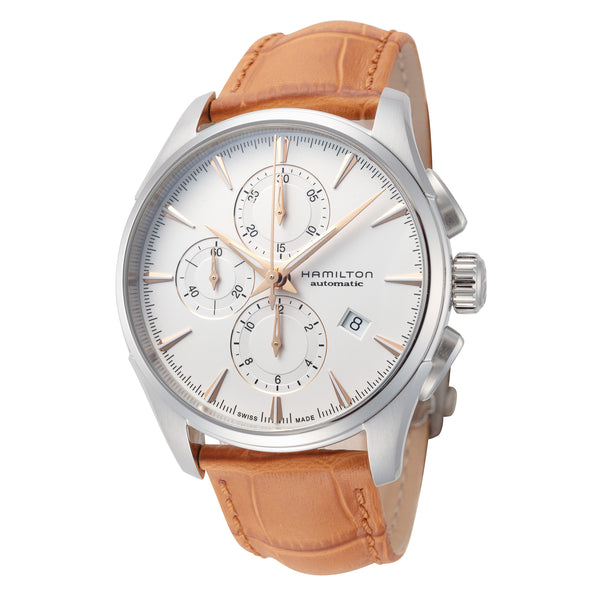 Hamilton Men's Jazzmaster Automatic Watch. The case is built with high-quality Stainless Steel and can withstand up to 100 m (330 feet) of water resistance. The dial is Silver and protected by a Sapphire Crystal Scratch Resistant. The Strap is Brown Leather with a Deployment Clasp. The movement is Swiss-Made Automatic. (H32586511)
