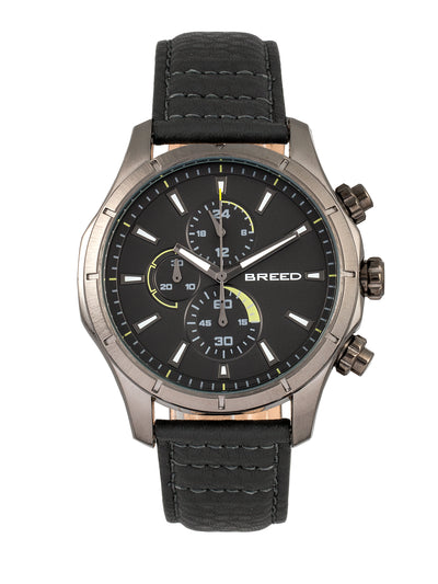 Brushed Alloy Case Japanese Miyota JS10 Quartz Movement Full-Function Chronograph Non-Glare Scratch Resistant Mineral Crystal Logo-Engraved Stainless Steel Caseback Genuine Leather Crocodile-Embossed Strap Logo-Engraved Stainless Steel Clasp Luminous Hands Luminous Markers 24-Hour Sub-Dial 47mm Case Diameter 5 ATM Water Resistance