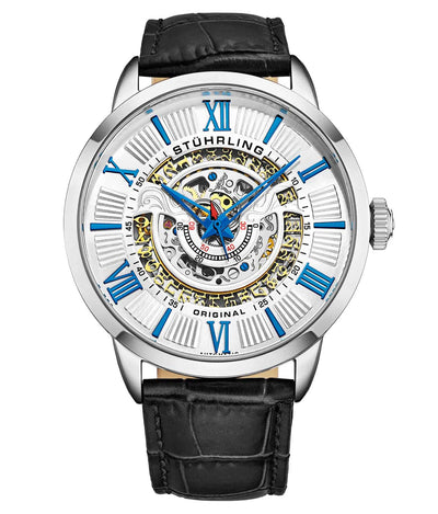 Men's Partially Skeletonized Automatic Watch with Calander, Stainless Steel Silver Tone Case on Alligator Embossed Black Genuine Leather Strap, Silver Tone Dial with Blue Skeletonized Hands, Blue, Gold Tone and Red Accents
