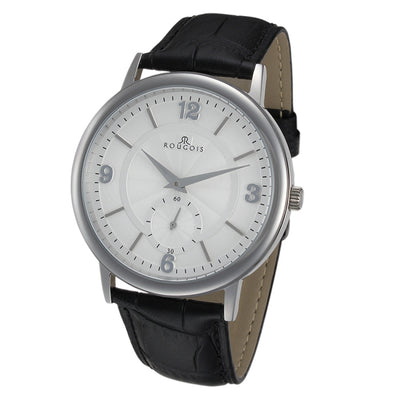 A classic black faux leather wristband holds the classic-style watch face in place. The white textured style dial features silver tone Arabic numbers and tick marks for hours along with black tick marks for minutes. The bottom center features a separate section for a second hand and black tick marks and Arabic numbers for accurate timekeeping.SpecificationsBrand Name: Rougois (pronounced Roojwa)Model number: 801SW-BKTechniqueCase Material: Stainless SteelMovement Type: QuartzCalendar Type: noneCrystal: MineralWater Resistant: 3 ATMDesignStyle: AnalogCase Shape: RoundDiameter: 42 mmCase Thickness: 6.8 mmColor of the dial: White (Textured Design)Hands Color: SilverCaseback: Snap-downCrown: Push/pullBandBand Color: BlackType Band: LeatherClasp Type: BuckleStrap: 22 mm width / 9.125 inch longWarranty: 1 Year