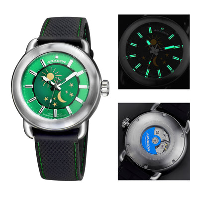Sophisticated details compel attention to the ARAGON Millipede EVO Sun & Moon Automatic. Millipede EVO features a smoothly rounded stainless steel case and powered by the newest Japanese NH34 GMT automatic movement and had modified to a large sun & moon am/pm indicator dial and matching with the outer dial color in vertical brushed finish.
