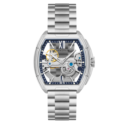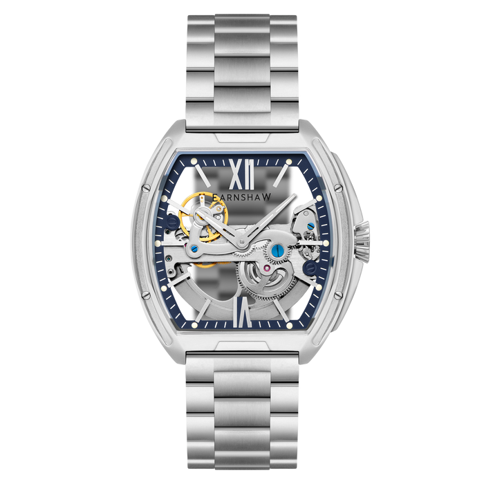 Sleek and striking, the Knightsbridge Automatic embraces openwork design with a fully transparent dial and exposed movement. Housed in a 45mm barrel-shaped case, this spectacular timepiece features Roman numeral accents and a double-curved lens. Pairing traditional elegance with contemporary flair, it redefines classic watchmaking.