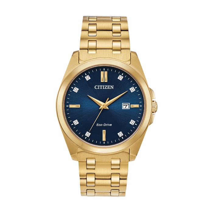 This Citizen Corso collection offers timepieces that are accented with vibrant diamond hour markers in a combination of functional simplicity with a touch of elegance. This timepiece, featured with a gold-tone stainless steel case and bracelet, adds an extra touch with the azure blue dial. Featuring our Eco-Drive technology powered by light, any light. Never needs a battery. Caliber number E111.