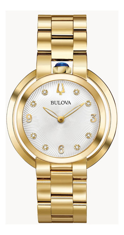 Welcome! OFFICIAL Bulova STOREBulova 97P125 Analog Quartz Gold WatchPRODUCT DESCRIPTION- Brand: Bulova- Model: 97P125- Function: Analog- Band Material: Stainless Steel- Case Material: Stainless Steel- Case Diameter: 35mm- Crystal Type: Sapphire- Movement: Quartz- Gender: Women's- Warranty: 12 months- Water Resistance: 3 ATM (30 meters)IMPORTANT!This watch is water resistant to 3 ATM (30 meters), making it resistant to rain and splashes. (We do not recommend exposing it to high-temperature water, such as hot showers.)KEY BENEFITSDurability: With its stainless steel case and high-quality stainless steel strap, this watch is designed to withstand daily wear and tear, ensuring it will accompany you in all your activities.Style: Its design fits perfectly with any occasion, from formal meetings to casual events, keeping you looking fashionable.Comfort: With an ergonomic strap, this watch offers a comfortable and secure fit, ideal for all-day wear without discomfort.