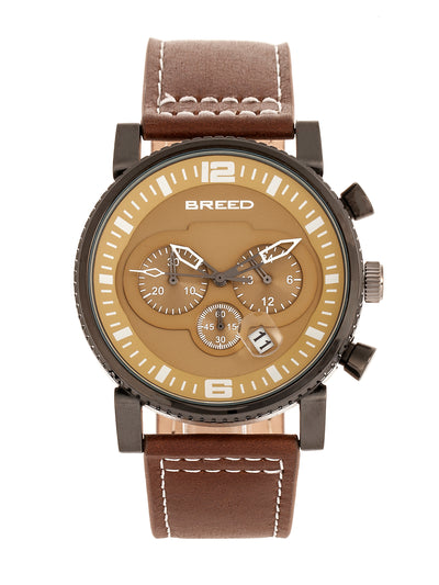 Polished Alloy Case Japanese Miyota OS21 Quartz Movement Full-Function Chronograph Non-Glare Scratch Resistant Mineral Crystal Logo-Engraved Stainless Steel Caseback Genuine Leather Strap Logo-Engraved Stainless Steel Clasp Magnified Date Display 45mm Case Diameter 5 ATM Water Resistance