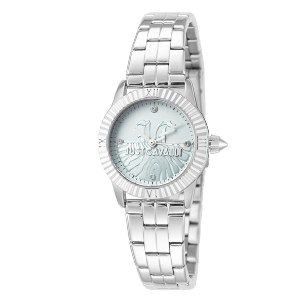 Just Cavalli Women's SET 26mm Watch. The case is built with high-quality Stainless Steel and can with stand up to 30 m (100 feet) of water resistance. The dial is Blue and protected by a Mineral Crystal. The Bracelet is Silver Stainless Steel and the movement is Quartz (JC1L328M0045)