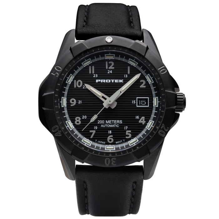 ProTek is a brand of tritium tactical watches. ProTek is designed for Law Enforcement, Fire Fighters, SWAT, Tactical, Military, Special Forces, and First Responders. ProTek is a no-excuses brand that is Rugged at Heart and built to handle what life demands in any environment, lending credence to the tag line All Terrain Watches. Specifications: 42mm 316L Stainless Steel Case and Embossed Screw Caseback, Unidirectional 120-Click Dive Timing Bezel, Steel Screw Crown with Multiple O-Rings, Sapphire Crystal with Antireflective Coating, Water Resistant to 200 Meters, Waterproof Genuine Italian Leather Strap (22mm x 20mm), Dependable Japanese AUTOMATIC NH35 Time Module 3 Hand & Date Movement, Swiss self-powered ProGlo illumination system is 100X brighter than conventional lume and glows continuously for 25 years without a need to be "charged" by an external light source.