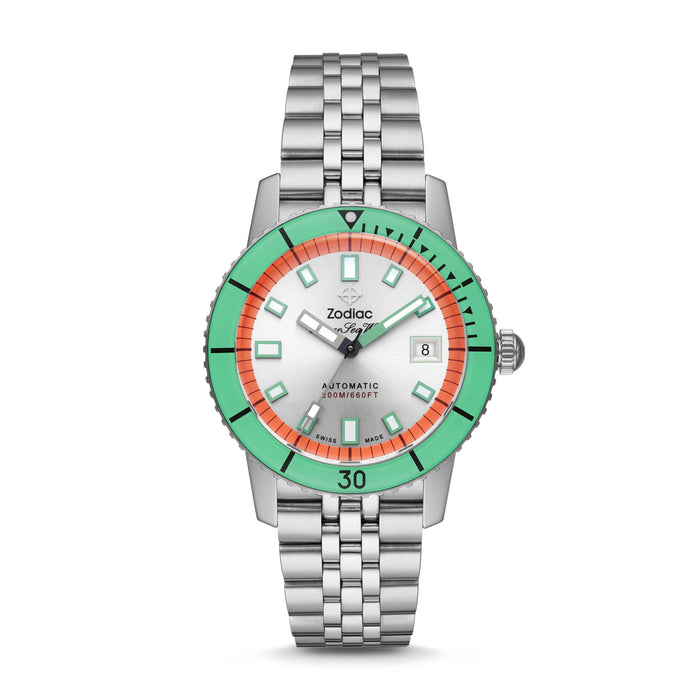 ZODIAC's most celebrated timepiece is back. Featuring a stainless-steel case and uni-directional mineral crystal topring, silver sunray dial, five-link stainless-steel bracelet and C3 SuperLuminova hands and indexes, Sea Wolf conveys the brand's commitment to definitive style with timeless roots. The STP 3-13 automatic movement and sapphire crystal with anti-reflective coating stay true to the quality and style of ZODIAC.