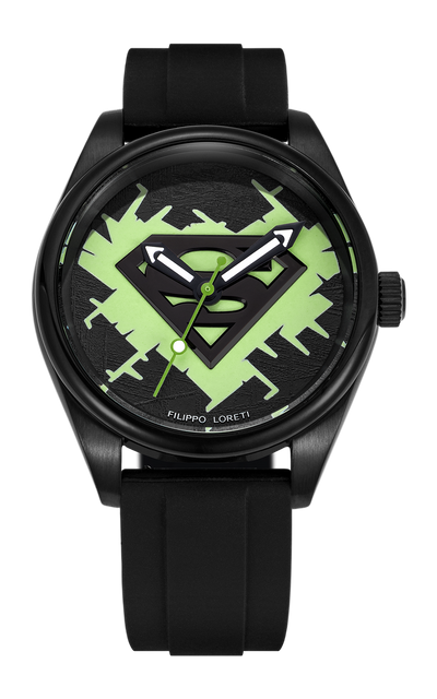 The Watches of Steel have landed: the full-blown tribute to the greatest Super Hero ever created. Superman x Filippo Loreti was conceived by a Fan of Super Heroes & Watches. Now they come to you. Forged in stainless steel, they are lit with pure Kryptonian energy. And these dials? They explode with details. Look at the Deep Pressed Meteorite Pattern. And that raised 3D S crest at the center and surrounded by the Green of the Kryptonite? Its the vision of a Fan that came to reality. And the Lume? Straight-up Kryptonite inspiration that glows green in the dark. Thats not all! Wrapped in Sapphire glass and Stainless Steel case, this watch is made to last. And Black PVD coating to symbolize the battle hardened Hero. Its 100 meters water resistant, dont fear water with it. This watch isnt a toy. This is a Real Quality watch for the Man who grew up believing in something bigger and still does. One look and youll feel it: the symbol of Memory & Hope on your wrist.Inside? NH35 Automatic movement. No batteries, just raw, self-powered movement like a hero in motion. Because Superman doesnt run on AAAs. He runs on willpower. And so does this watch. And now? You get to wear it, and power it with your wrist.