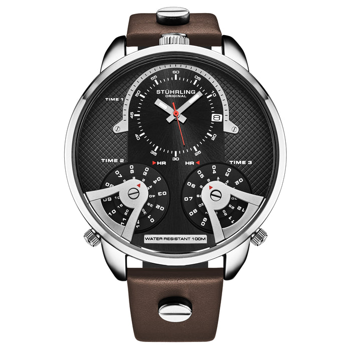 Men's Triple Time Quartz Watch, Silver Tone Case on Brown Genuine Leather Strap with Silver Tone Pins, Black Guilloche-like Damier Design Dial with Two Silver Tone Rim Subdials, and Silver Tone