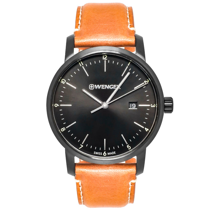 NEW WITH TAGS, ORIGINAL BOX AND BOOKLETWENGER - "Urban Classic" Men's Watch, Stainless Steel Case, Black Dial, Brown Calf Leather Bracelet, Analog Quartz Movement - 01.1741.136MSRP $185.00Wenger 01.1741.136 Urban Classic Men's watch features a 42mm wide and 10mm thick black stainless steel case with a fixed bezel and textured pull and push crown. Wenger 01.1741.136 is powered by Swiss quartz movement.Case Size: 42 mmCase Material: Stainless SteelCase Shape: RoundCase Color: Black PVDCase Thickness: 10 mmCase Back: Screw DownMovement: Swiss QuartzCalendar: DateFeatures: Fixed BezelFunctions: Hours, Minutes and Seconds, 12 Hour DialDial: BlackMarker Style: Stick Index and Arabic NumeralWater Resistant: 100 MetersCrown: Pull and PushCrystal: Sapphire Coated MineralBand Material: LeatherBand Color: BrownBand Width: 22mmClasp Type: Buckle