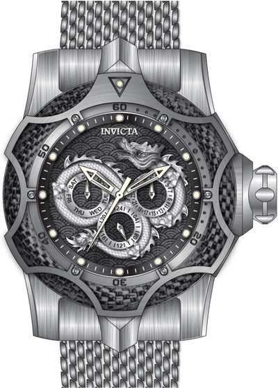 Invicta Men's Venom 53mm Watch. The case is built with high-quality Stainless Steel and can with stand up to 100 m (330 feet) of water resistance. The dial is Black and protected by a Mineral Crystal. The Bracelet is Silver Stainless Steel and the movement is Quartz (IN-49188)
