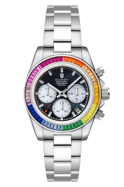 Step into modern elegance with the Accelero Rainbow Chronograph. Powered by a chronograph movement and featuring a sleek 40mm case, this watch is the epitome of refined style. The anti-reflective sapphire lens offers durability and clarity, making it a must-have for your collection. Discover the perfect blend of sophistication and performance today.