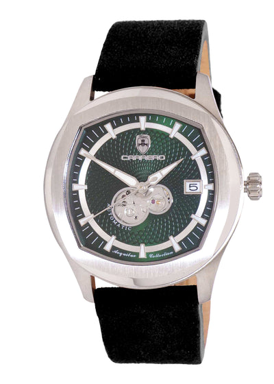 TORINO CARRERO MEN'S WATCH, 24-JEWELS AUTOMATIC, WITH HEART BEAT SUNRAY TEXTURED GREEN DIAL, STAINLESS STEEL CASE AND BLACK-SUED LEATHER BAND