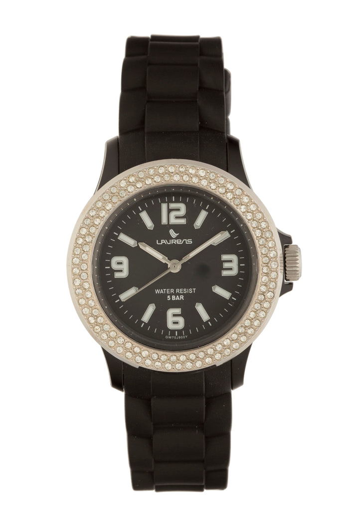 The beautiful Laurens Unisex Rotating Bezel Black Rubber Watch is a direct expression of unique personality and casual spirited style of the person who wears it. A unidirectional rotating plastic bezel with minute track frames the black dial featuring an easy-to-read magnified date display and second hand feature. Fashionable, comfortable and reliable the designed soft black rubber strap secures with a buckle clasp. Inside this fabulous contemporary designed watch beats the heart of a Swiss masterpiece that includes a protective mineral crystal window, quartz movement, and 165 feet water resistance. Live the Lauren experience as Italian style and Swiss precision join in unison.