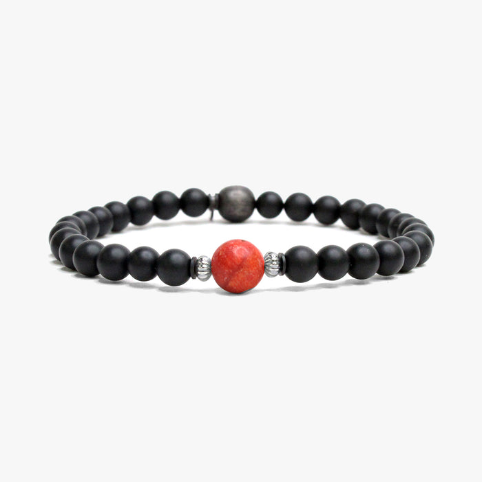 Black onyx. Marbled red sea sediment focal bead. Sterling detail. Bead Size: 6-8mm. Made by hand in California