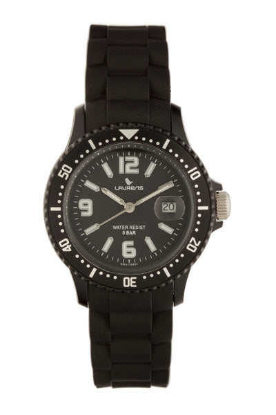 The beautiful Laurens Unisex Rotating Bezel Black Rubber Watch is a direct expression of unique personality and casual spirited style of the person who wears it. A unidirectional rotating plastic bezel with minute track frames the black dial featuring an easy-to-read magnified date display and second hand feature. Fashionable, comfortable and reliable the designed soft black rubber strap secures with a buckle clasp. Inside this fabulous contemporary designed watch beats the heart of a Swiss masterpiece that includes a protective mineral crystal window, quartz movement, and 165 feet water resistance. Live the Lauren experience as Italian style and Swiss precision join in unison.