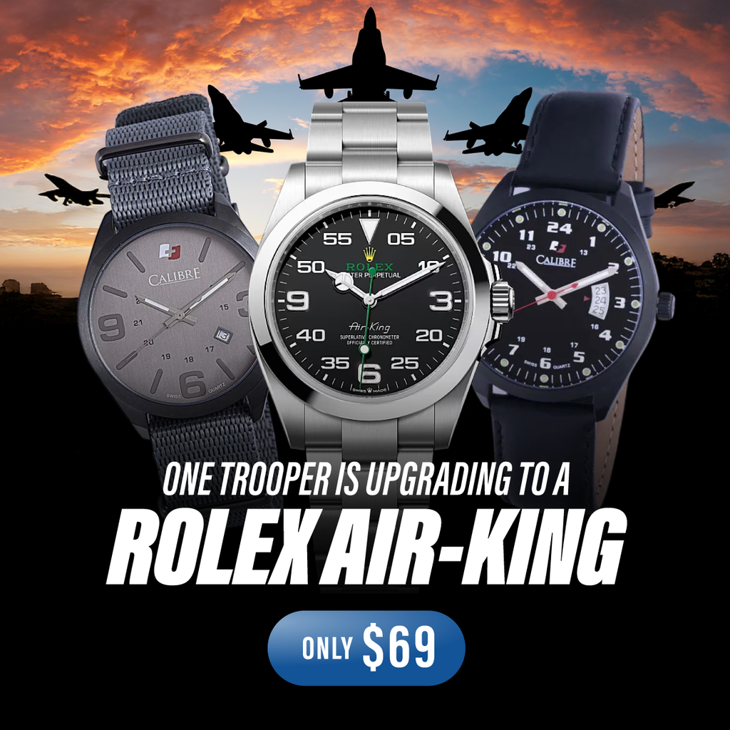 One purchaser will be randomly upgraded from their Calibre Trooper Watch to a Rolex Air King - an enduring icon of watchmaking, One of the most sought after Grail Timepieces out there. ($8900 Value)