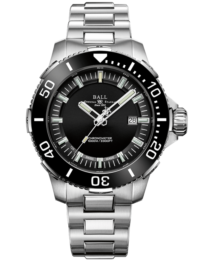 The Ball DeepQuest II is a remarkable diver's watch driven by the automatic BALL RR1101-C movement, which is COSC certified. The timepiece is equipped with 15 micro gas tubes on the hands and dial, ensuring exceptional readability in low light. Its patented helium release valve crown and unidirectional rotating ceramic bezel, illuminated with Super LumiNova, enhance its functionality. The watch is housed in a 42mm single block titanium case with a height of 15.5mm, providing a robust shock resistance of 7,500Gs and an extraordinary water resistance of 1000m. Antimagnetic properties are ensured up to 4,800 A/m. The Ball DeepQuest II offers a choice of a tapered titanium and stainless steel bracelet or a rubber strap, both featuring a patented folding buckle.