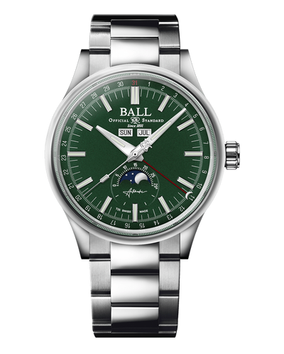 The Ball Engineer II Moon Calendar 40mm watch model # NM3016C-S1J-GR features: stainless steel case, brushed & polished stainless steel strap with a folding clasp / buckle. It has a green dial, fixed bezel. The case size is 40mm. This automatic watch is powered by the caliber BALL RR1807 is a 28800 VPH movement and has a power reserve of 38 hours . The Ball NM3016C-S1J-GR uses a sapphire crystal and has a water resistance of 100m/330ft.