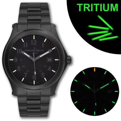 The ArmourLite Field Series watches with long-lasting Swiss tritium illumination have been a very popular staple in our collection since 2011. The newest generation of these ultra tough and high performance Swiss Made watches introduces a slimmer and more lightweight 42mm case, while retaining the classic and distinctive design of a field watch. Each model in this series is protected by our unique shatterproof Armourglass crystal that has a hardness rating of 6,000 Vickers — whereas most watch crystals are only rated to 700 Vickers. For the utmost in reliability and timekeeping accuracy, each watch is powered by a maintenance-free Swiss Made Ronda 715 quartz movement with a date display at 3:00 and a low-battery indicator. The functional yet easy to read dial features Arabic numerals for both the 12 and 24 hour markings. Your watch becomes a lot more useful as you can easily tell the time in not only the day, but also at night with the help of 15 self-powered tritium tubes that are set into each of the 3 hands and at every hour on the dial. The case and all components of the watch are constructed out of hypoallergenic and durable 316L stainless steel. The screw-down crown and caseback ensure an adventure-ready water resistance of 100 meters. In lieu of the standard spring bar pins, heavy-duty screw bars secure the band firmly in place for strenuous activities. Overall, this watch will provide years of reliable performance no matter where you take it while looking stylish on your wrist. It is built for both city life and the great outdoors! Where will your watch take you?