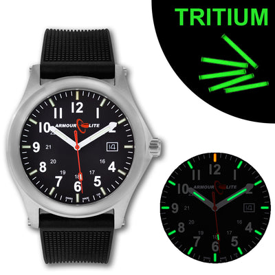 The ArmourLite Field Series watches with long-lasting Swiss tritium illumination have been a very popular staple in our collection since 2011. The newest generation of these ultra tough and high performance Swiss Made watches introduces a slimmer and more lightweight 42mm case, while retaining the classic and distinctive design of a field watch. Each model in this series is protected by our unique shatterproof Armourglass crystal that has a hardness rating of 6,000 Vickers — whereas most watch crystals are only rated to 700 Vickers. For the utmost in reliability and timekeeping accuracy, each watch is powered by a maintenance-free Swiss Made Ronda 715 quartz movement with a date display at 3:00 and a low-battery indicator. The functional yet easy to read dial features Arabic numerals for both the 12 and 24 hour markings. Your watch becomes a lot more useful as you can easily tell the time in not only the day, but also at night with the help of 15 self-powered tritium tubes that are set into each of the 3 hands and at every hour on the dial. The case and all components of the watch are constructed out of hypoallergenic and durable 316L stainless steel. The screw-down crown and caseback ensure an adventure-ready water resistance of 100 meters. In lieu of the standard spring bar pins, heavy-duty screw bars secure the band firmly in place for strenuous activities. Overall, this watch will provide years of reliable performance no matter where you take it while looking stylish on your wrist. It is built for both city life and the great outdoors! Where will your watch take you?