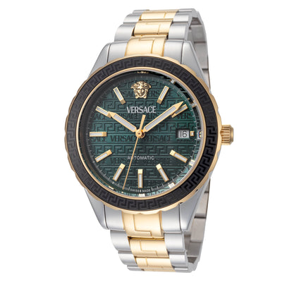 Versace Men's Hellenyium 42mm Watch. The case is built with high-quality Stainless Steel and can with stand up to 50 m (165 feet) of water resistance. The dial is Green and protected by a Sapphire Crystal Scratch Resistant. The Bracelet is Two Tone Stainless Steel and the movement is Automatic (VEQCA0524)