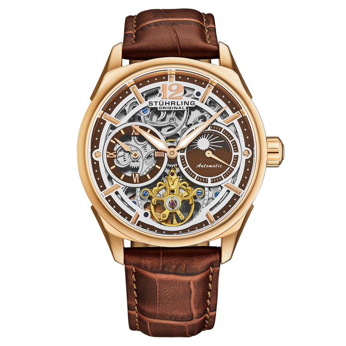 Mens Skeleton Stainless Steel Case - Brown/Rose Gold Dial - Rose Gold Hands- Brown Strap