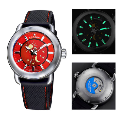 Sophisticated details compel attention to the ARAGON Millipede EVO Sun & Moon Automatic. Millipede EVO features a smoothly rounded stainless steel case and powered by the newest Japanese NH34 GMT automatic movement and had modified to a large sun & moon am/pm indicator dial and matching with the outer dial color in vertical brushed finish.