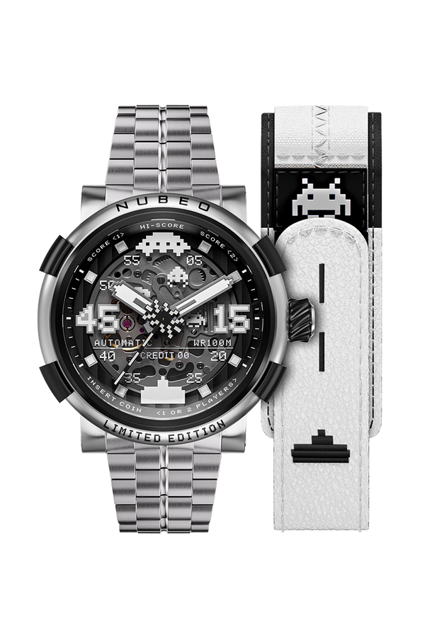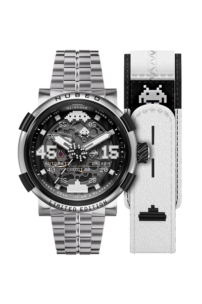 A bold tribute to one of the most iconic video games in history, this striking timepiece features a 3D multi-layered skeletonized dial enhanced by luminous, pixel-inspired details that capture the spirit of classic gameplay. Turn it over to reveal the exhibition caseback, where a custom luminous rotor pays homage to the relentless waves of alien invaders that shaped a generation of gaming.