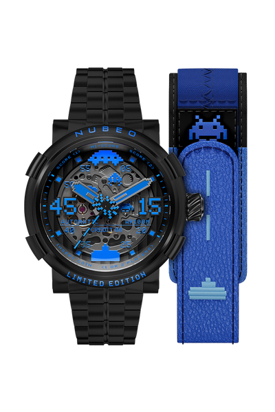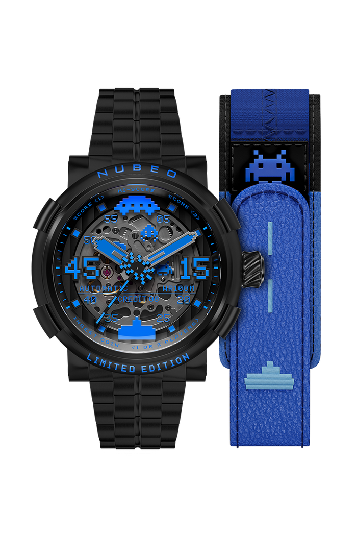 A bold tribute to one of the most iconic video games in history, this striking timepiece features a 3D multi-layered skeletonized dial enhanced by luminous, pixel-inspired details that capture the spirit of classic gameplay. Turn it over to reveal the exhibition caseback, where a custom luminous rotor pays homage to the relentless waves of alien invaders that shaped a generation of gaming.