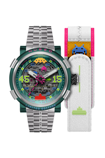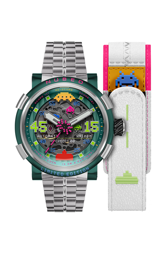 A bold tribute to one of the most iconic video games in history, this striking timepiece features a 3D multi-layered skeletonized dial enhanced by luminous, pixel-inspired details that capture the spirit of classic gameplay. Turn it over to reveal the exhibition caseback, where a custom luminous rotor pays homage to the relentless waves of alien invaders that shaped a generation of gaming.