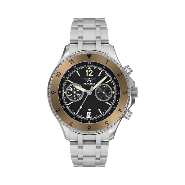 The Aeromat PNY Gold Steel Link is a promising aviation watch bearing the watchmaking heritage. It has a satin black dial, double print indexes, and shiny silver hands with cream luminous. Its sturdy brushed case is made of stainless steel with matte black aluminum inlay and has a round polished silver crown. It sports a five-link stainless steel bracelet and powered by the Seiko VK64 quartz movement.