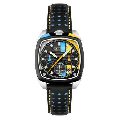 Inspired by vintage racing chronographs and turbocharged for todays style-savvy drivers, the Taurus Chronograph features a bull-head configuration with aluminium pushers, placing control at the top for intuitive, driver-focused operation.Encased in a 39mm stainless steel square chassis with classic racing colours, the Taurus charges forward with purpose and punch.