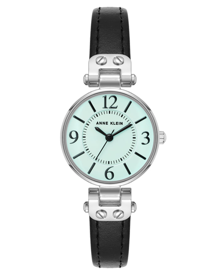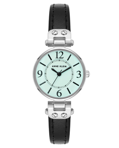 Anne Klein Women's 34mm Aqua Quartz Watch 10/9443AQBK. The case is built with high-quality Alloy and can withstand up to 30 M of water resistance. The dial is Aqua and protected by a Mineral crystal. The Bracelet is Black Leather. The movement is Quartz. (10-9443AQBK)