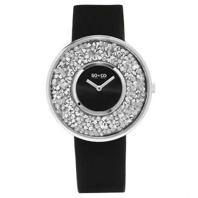 Women's Crystal Studded Filled Quartz Watch, Silver Tone Case on Black Satin Twill Covered Genuine Leather Strap, Black Center Dial and Outer Dial Filled with Silver Crystal Studs, and Silver Tone Accents