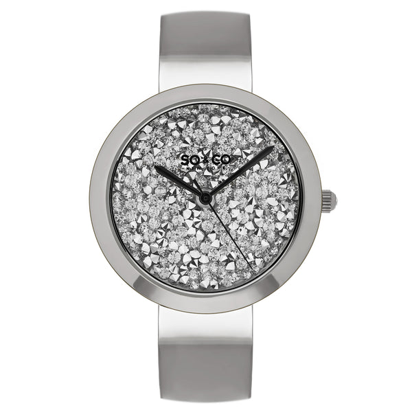 Women's Crystal Stud Filled Watch, Silver Tone Case on Silver Tone Stainless Steel Bangle Watch, Silver Tone Crystal Studded Filled Dial, with Black Accents