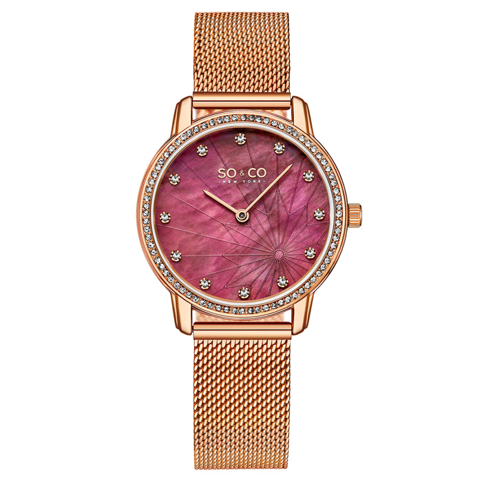 Ladies Quartz Rose/Gold Toned Case, Rose/Gold Toned Crystal Studded Bezel, Red MOP Dial, Rose/Gold Toned Hands, Rose/Gold Toned Crystal Markers, Rose/Gold Toned Mesh Strap Watch