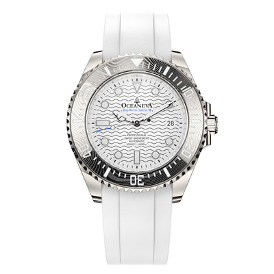 The watch is paired with a high-grade German FKM rubber strap in white and a polished titanium buckle. The buckle is secured with a screw mechanism, ensuring durability and confidence during any activity.